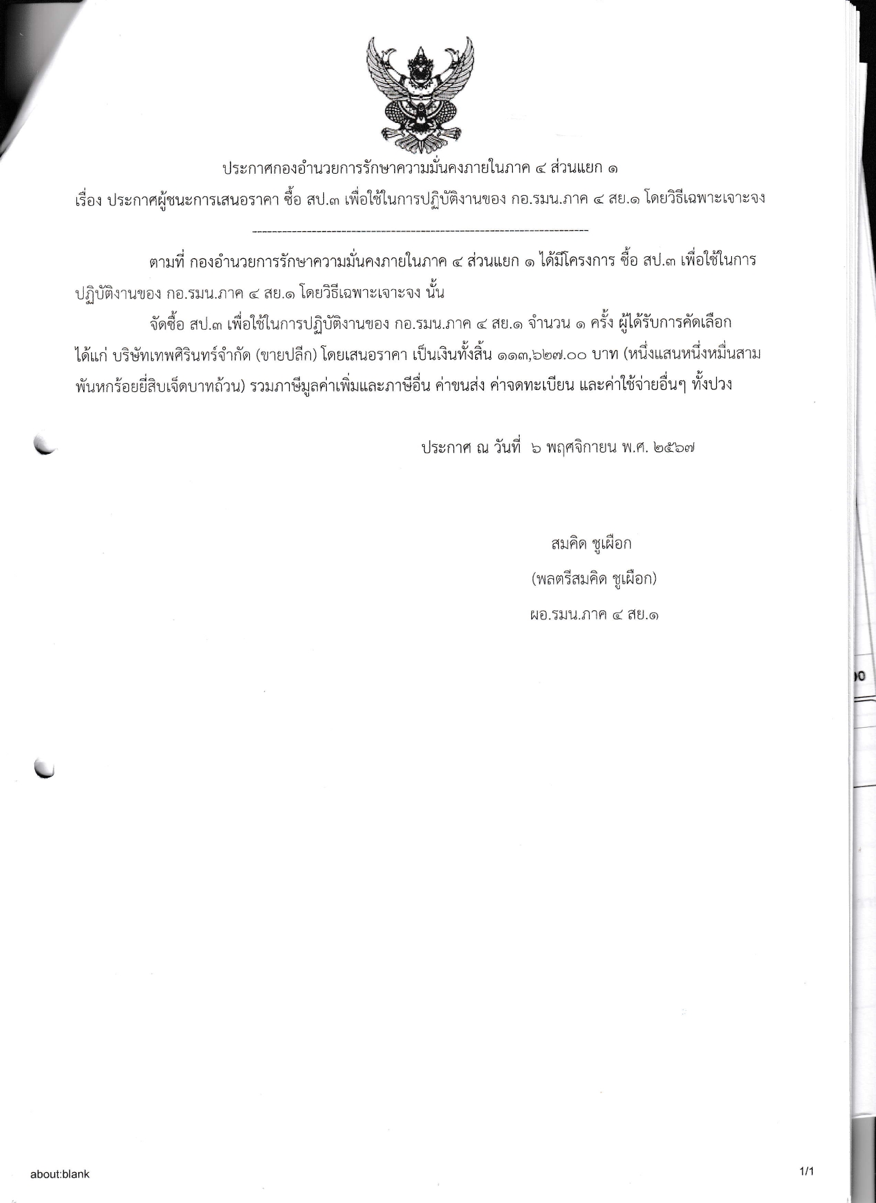 ประกาศกองอำนวยการรักษาความมั่นคงภายในภาค 4 ส่วนแยก 1 เรื่อง ประกาศผู้ชนะการเสนอราคา จัดซื้อ สป.3 เพื่อใช้ในการปฏิบัติงาน ของ กอ.รมน.ภาค 4 สย.1 โดยวิธีเฉพาะเจาะจง