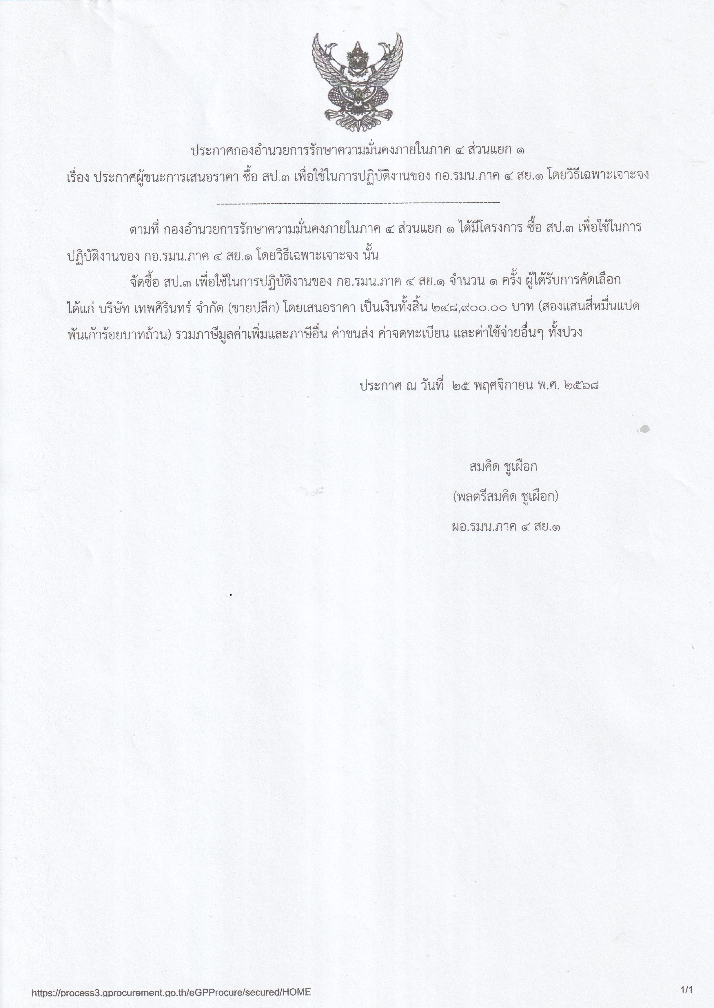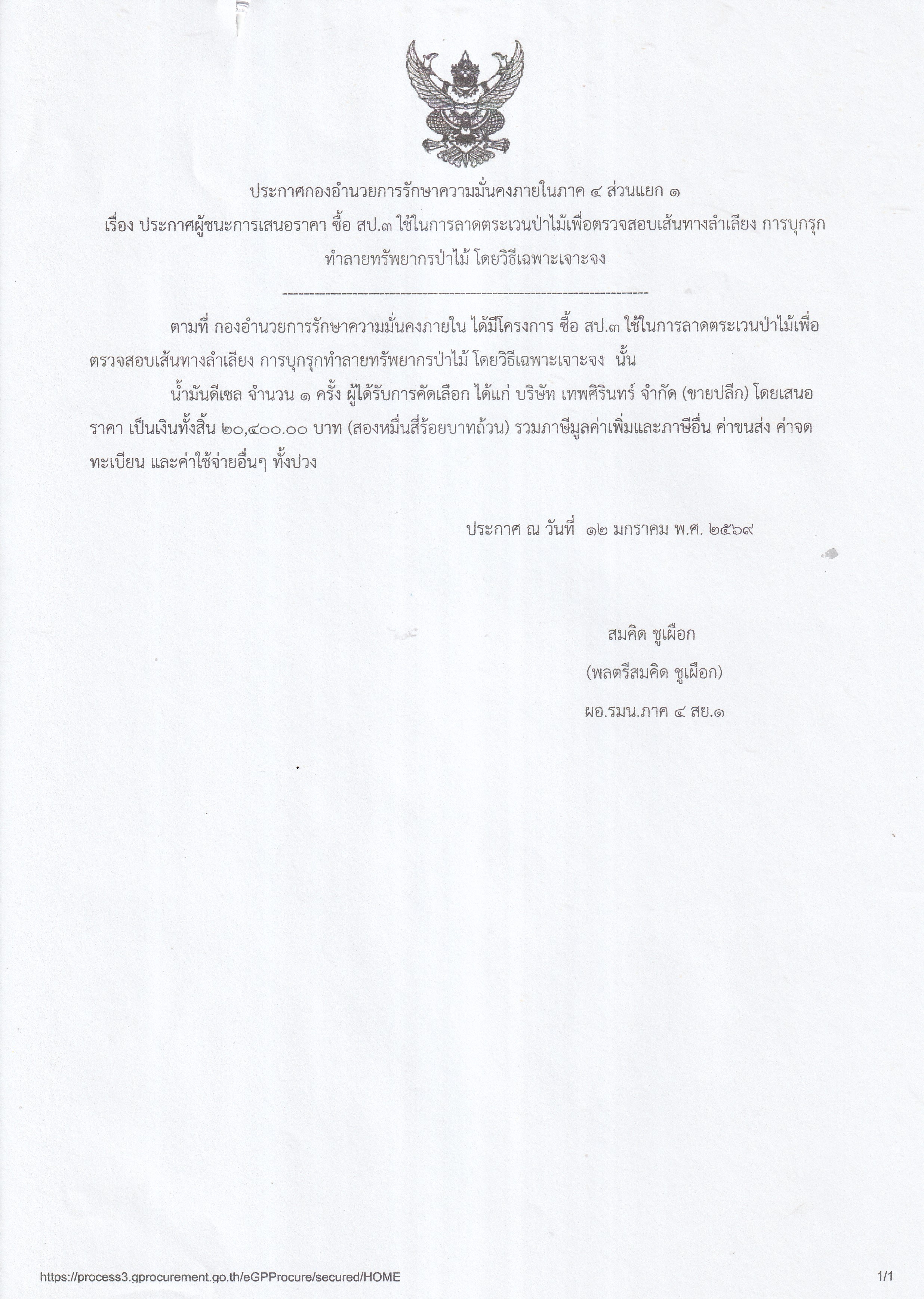 เรื่อง ประกาศผู้ชนะการเสนอราคา ซื้อ สป.3 ใช้ในการลาดตระเวนป่าไม้เพื่อตรวจสอบเส้นทางลำเลียง การบุกรุกทำลายทรัพยากรป่าไม้ โดยวิธีเฉพาะเจาะจง