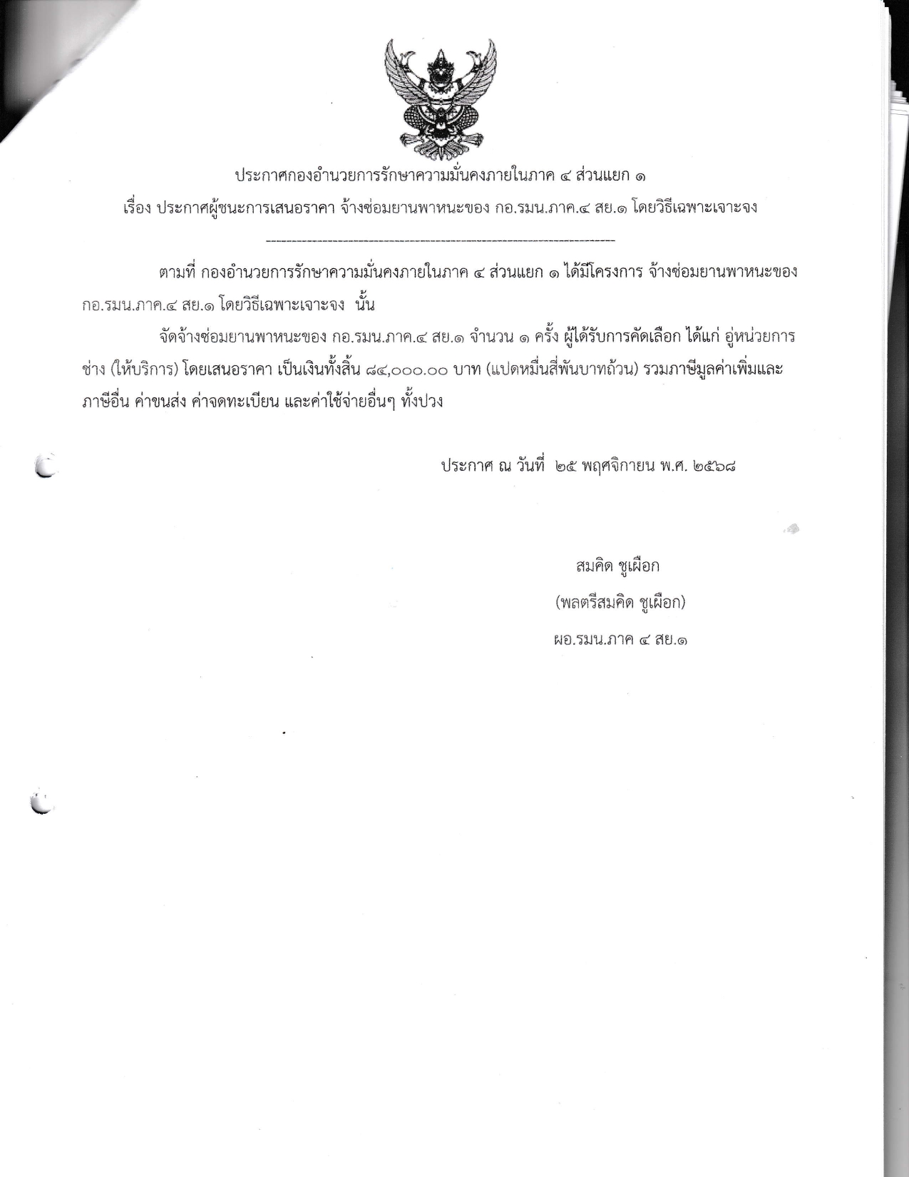 ประกาศกองอำนวยการรักษาความมั่นคงภายในภาค 4 ส่วยแยก 1 เรื่อง ประกาศผู้ชนะการเสนอราคา จ้างซ่อมยานพาหนะของ กอ.รมน.ภาค.4 สย.1 โดยวิธีเฉพาะเจาะจง