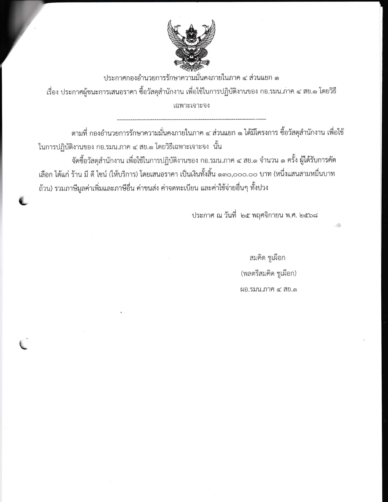 เรื่อง ประกาศผู้ชนะการเสนอราคา ซื้อวัสดุสำนักงาน เพื่อใช้ในการปฏิบัติงานของ กอ.รมน.ภาค 4 สย.1 โดยวิธีเฉพาะเจาะจง
