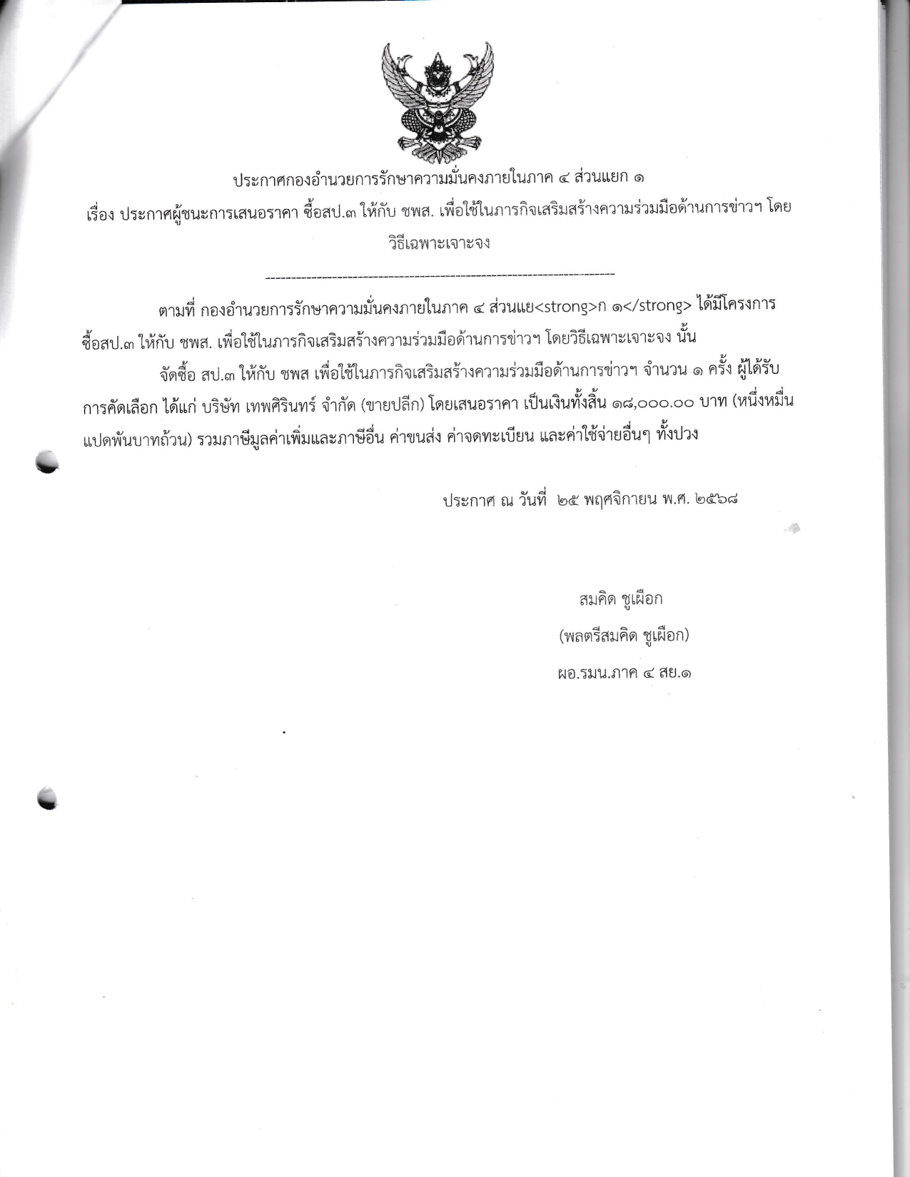 เรื่อง ประกาศผู้ชนะการเสนอราคา ซื้อ สป.3 ให้กับ ชพส. เพื่อใช้ในภารกิจเสริมสร้างความร่วมมือด้านการข่าว ฯ โดยวิธีเฉพาะเจาะจง