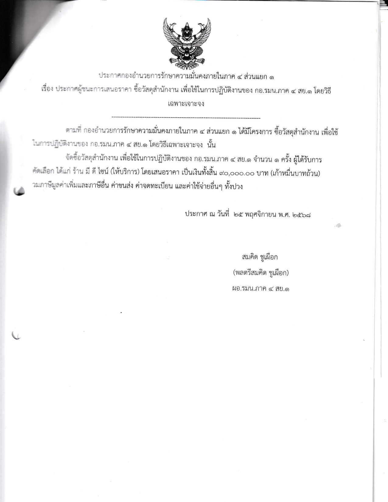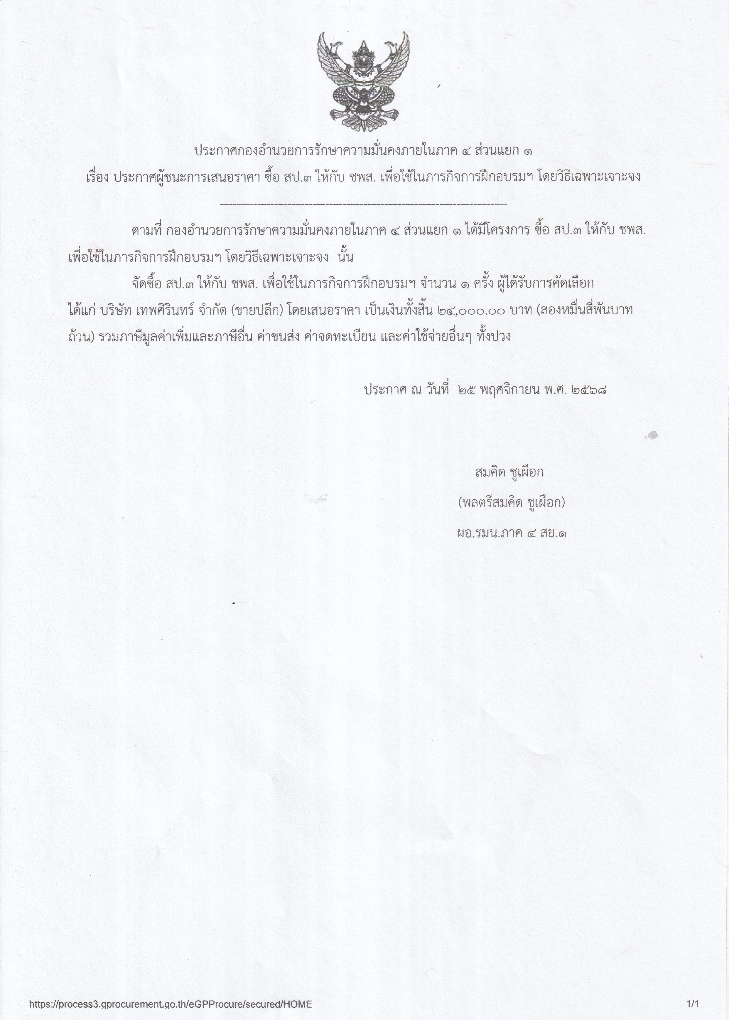 เรื่อง ประกาศผู้ชนะการเสนอราคา ซื้อ สป.3 ให้กับ ชพส. เพื่อใช้ในภารกิจการฝึกอบรมฯ โดยวิธีเฉพาะเจาะจง