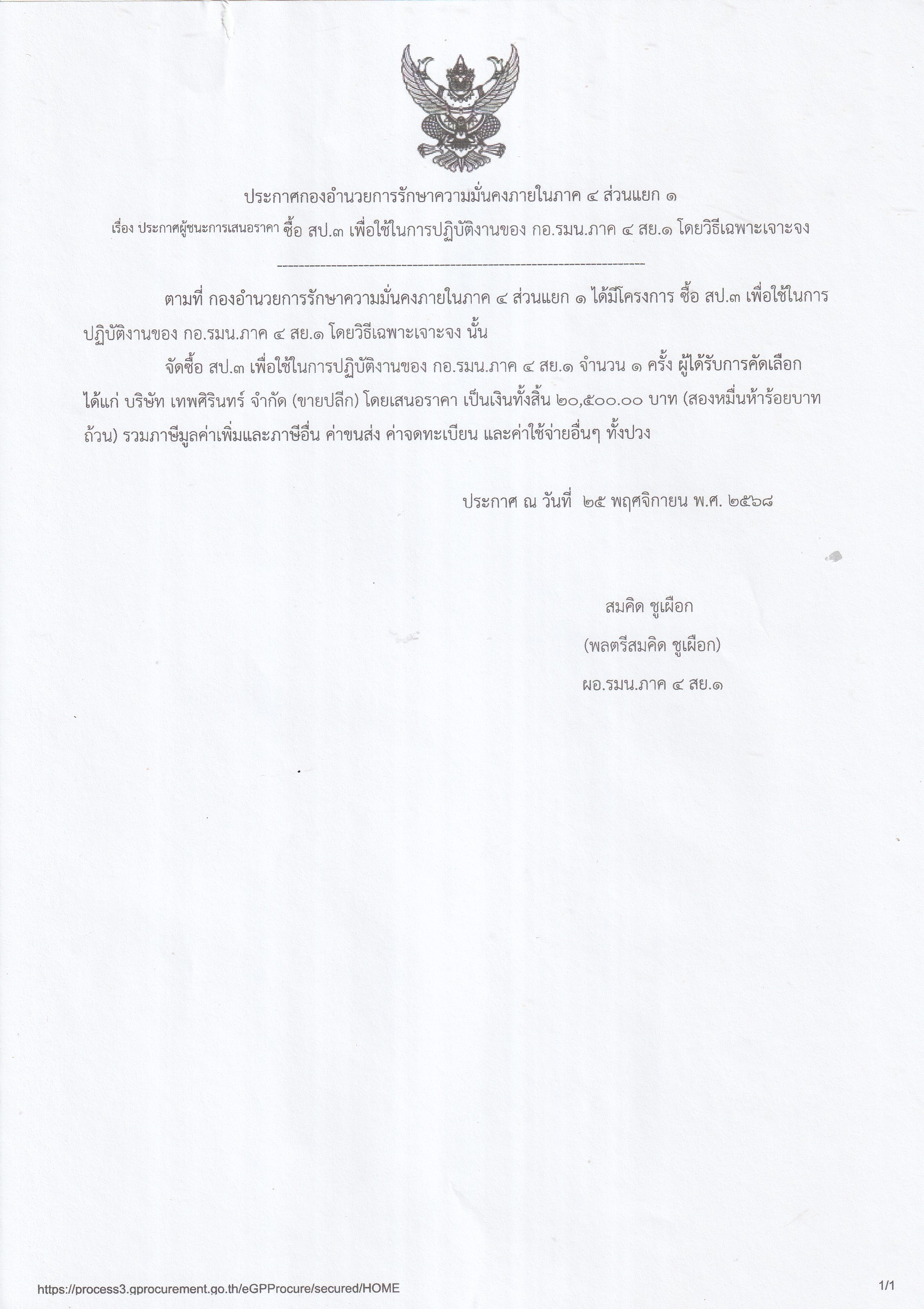 เรื่อง ประกาศผู้ชนะการเสนอราคา ซือ สป.3 เพื่อใช้ในการปฏิบัติงานของ กอ.รมน.ภาค 4 สย.1 โดยวิธีเฉพาะเจาะจง